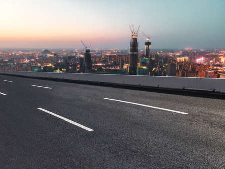 Asphalt highway road and pedestrian bridge with modern city buildings scenery