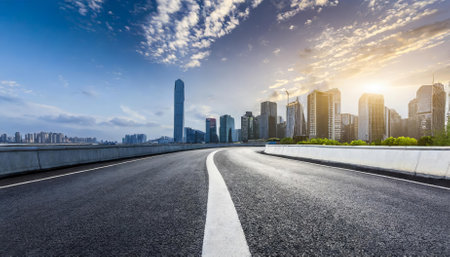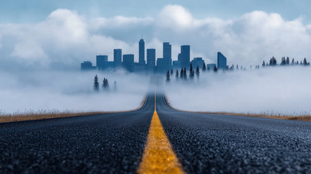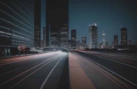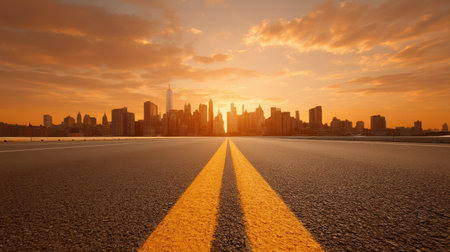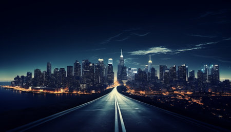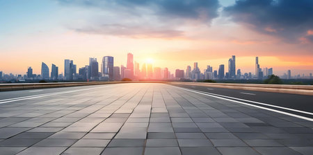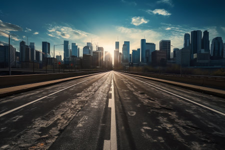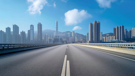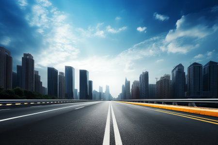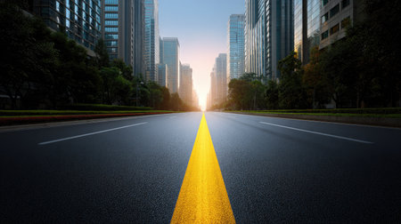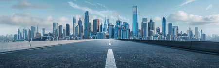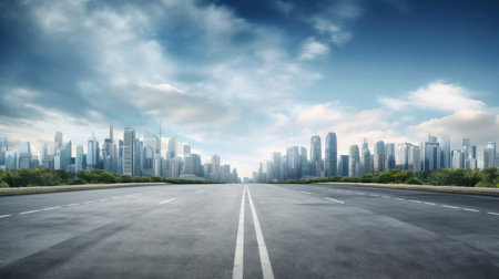 A wide, empty asphalt road stretches seamlessly into a bustling city skyline with modern architecture and a vivid sky, symbolizing progress, urban development, and limitless potential in a clean