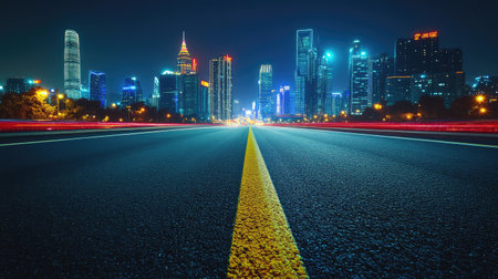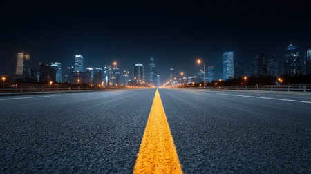 A vibrant urban highway captured at night, featuring a striking city skyline accentuated by bright lights and a bold yellow line that leads into the distance.
