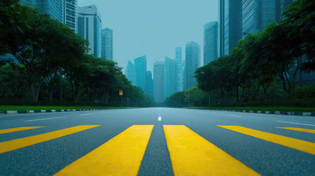 A serene urban scene featuring an empty road with yellow crossing lines, flanked by contemporary skyscrapers and vibrant greenery under a blue sky.