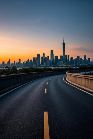 An expansive roadway stretches into the distance, framed by a vibrant city skyline at dawn, offering a serene blend of urban and natural elements in a tranquil scene.