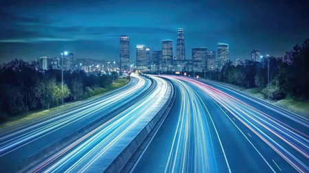 Night scene on a highway with a cityscape in the background, showcasing light trails from moving vehicles. The highway curves through the landscape, and urban skyscrapers are visible on the horizon.