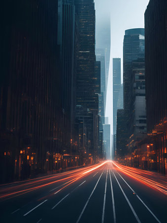 An urban scene depicts tall buildings flanking a roadway. Light trails from vehicles streak through the frame, suggesting movement in the twilight. The composition features a symmetrical arrangement, with cool tones dominating the environment. This imagery is suitable for various commercial uses, including website backgrounds and illustrations.