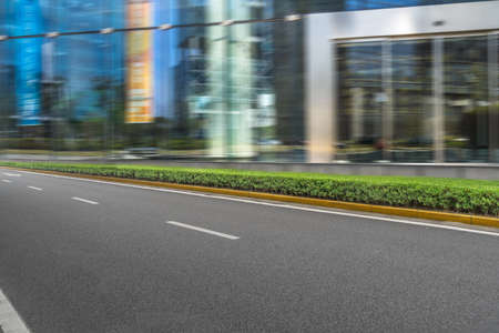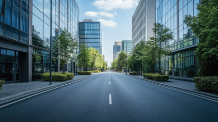 A clean, deserted road in a business district, with modern glass office buildings lining the street, evoking city life
