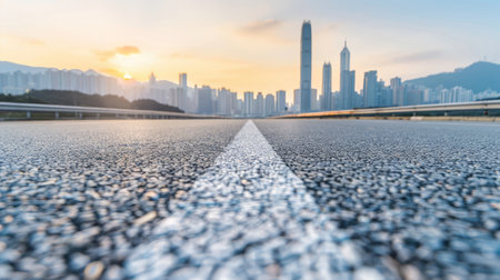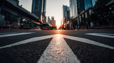 This striking image captures a low-angle view of an urban street at sunset, showcasing clear road markings and modern skyscrapers in the background.