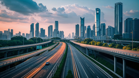 A dynamic view of a busy urban highway surrounded by modern skyscrapers. The scene captures the essence of city life with moving vehicles under a beautiful dusk sky.