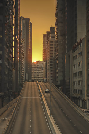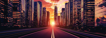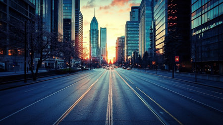 The image captures a city street lined with skyscrapers, showcasing an orange and red sunset. The composition features a road with yellow lines, creating a sense of perspective. This urban scene displays architectural details and warm colors. Suitable for commercial applications, the image may illustrate various themes.
