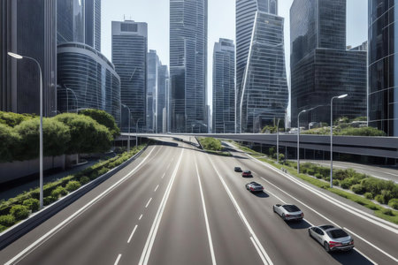 A vibrant city highway filled with cars during the day. The bustling urban landscape features towering skyscrapers and a modern infrastructure, showcasing a dynamic metropolitan environment. Perfect for themes related to travel, transport, and city life.
