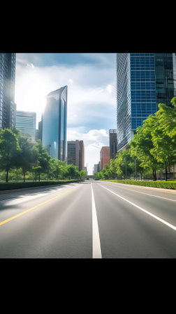 A wide, empty city street stretches forward, flanked by striking contemporary buildings with sleek glass facades and integrated vertical gardens. The clean lines of the architecture and the geometric create a sense of modern progress and sustainable urban development. The perspective draws the viewer down the road, emphasizing the scale and order of the cityscape. The bright daylight and subtle cloud cover highlight the futuristic and eco-friendly aspects of this modern metropolis,...