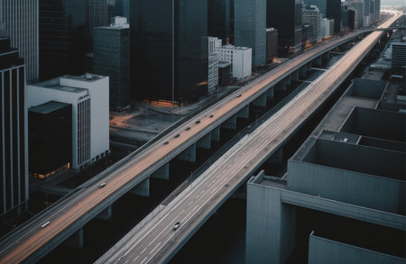 Elevated highways leading to a modern city skyline at dusk. Ai generated image