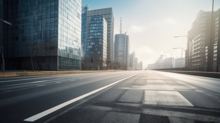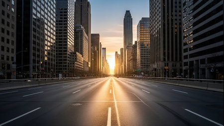 A captivating view of an empty road leading through a modern cityscape. The image features soaring buildings with morning sunlight illuminating the scene.