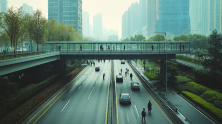 A captivating shot of a pedestrian bridge crossing over an expressway, with people walking and the busy road below, illustrating connectivity in urban environments.