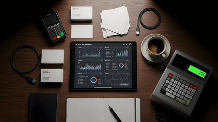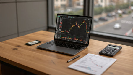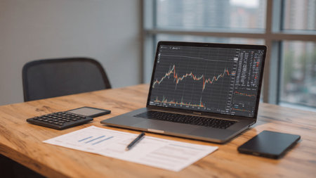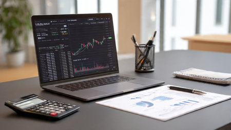 Modern workspace with financial data displayed on devices.