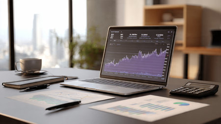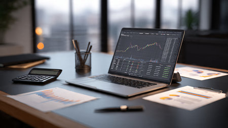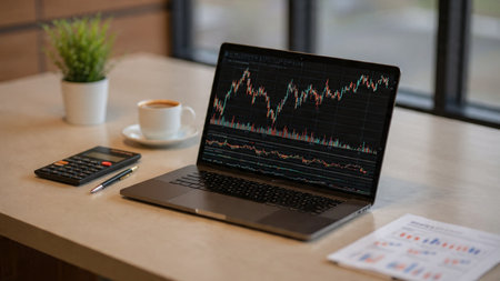 A crisp, modern desk setup showing financial charts on laptop with documents and coffee.