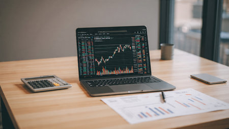 A professional desk with detailed market charts on a laptop and coffee beside financial summaries.