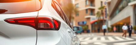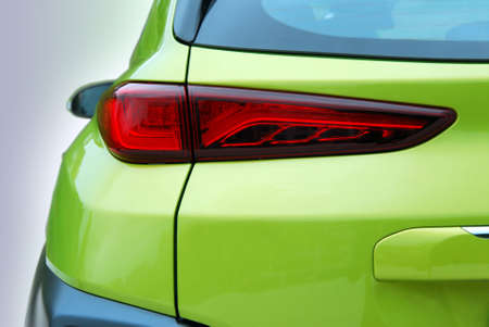 Close-up of contemporary car tail lights, displaying intricate design and illumination, emphasizing modern automotive technology and craftsmanship in vehicle aesthetics