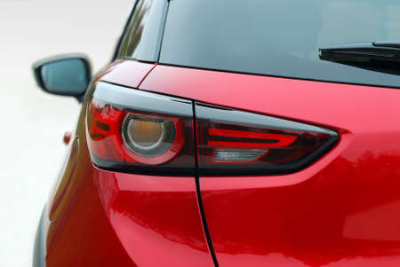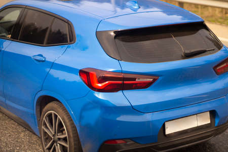 The back of a silver expensive crossover car: bumper, trunk lid, taillight on the back white background. Mock up for the advertising industry. New car concept