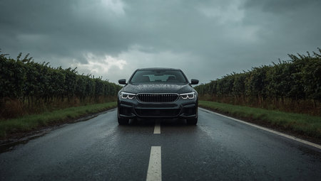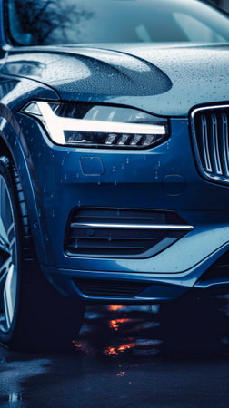 New luxury blue SUV car parked on concrete road beside the beach on rainy day with stormy sky. Front view of blue SUV car with sport design. Raindrops on car. Road trip travel. Driving in bad weather.