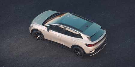 Blue compact SUV car with sport and modern design parked by beach at sunset. Hybrid and electric car technology. Car parking space. Automotive industry. Car care business background. Beautiful sky.