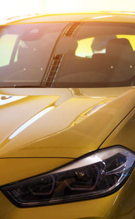 Close up of modern sedan headlamp. Front view shot from side of vehicle. Car headlight background.