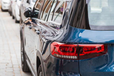 Riga, Latvia, Sep 24, 2021: rear LED lights closeup of nev VW ID4 electric SUV, model 2021, stylish exterior design of new car