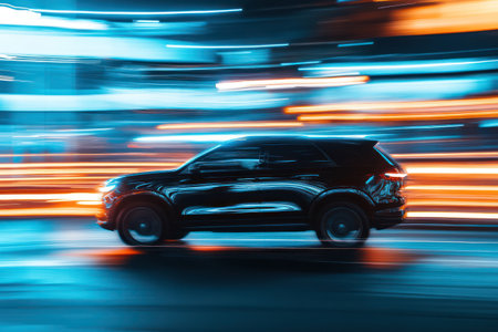 A high-speed SUV rushes through a glowing night city with motion blur and light streaks, symbolizing power, motion, and energy.
