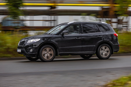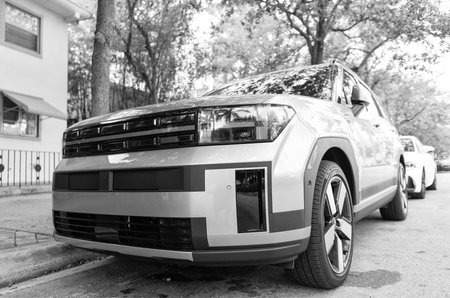 Miami, Florida, USA - December 08, 2024: 2024 Hyundai Santa Fe HEV Limited crossover SUV. Crossover car of Hyundai Santa Fe HEV type. Car of Hyundai parked outdoor. Hyundai Santa Fe, corner view