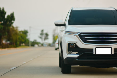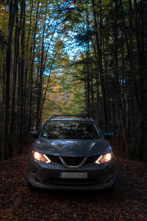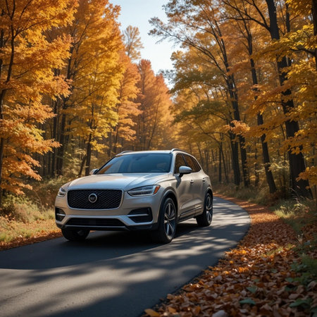 White suv car driving on a scenic forest road at sunset, enjoying the tranquility of nature. Ai generated image