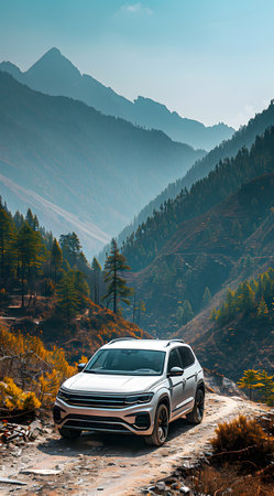 Electric suv cars parked in the view point with mountains in the background. generative ai