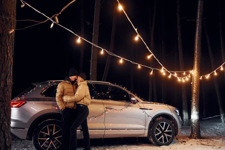 Love and hugs. Couple standing in the forest and celebrating New year.