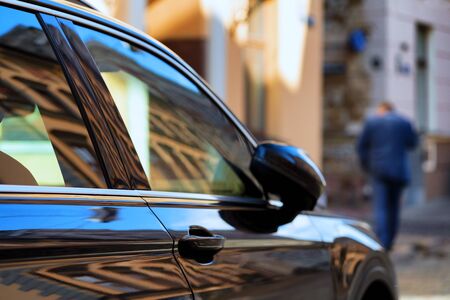 Side view of black mini van car parked on the empty street focus in the rear view mirror