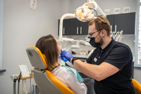 A dentist is performing a dental procedure on a female patient seated in a dental chair. The patient is positioned with her mouth open, while the dental device is held in place.
