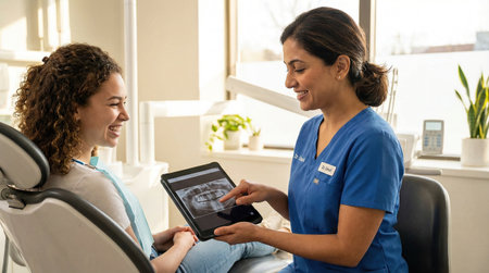 Dentist showing patient dental x-rays on a tablet in a modern clinic.