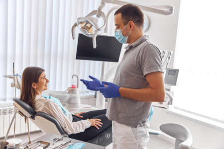 Male dentist in dental office talking with female patient and preparing her for treatment. Explaining the procedure of new dental implants.Rear view of the patient, focus on a dentist.