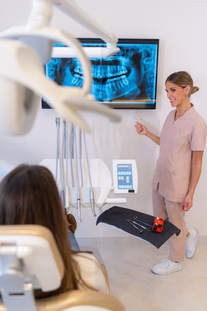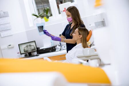 Pretty young female doctor with protective gloves examining radiograph with her patient in the dentist office