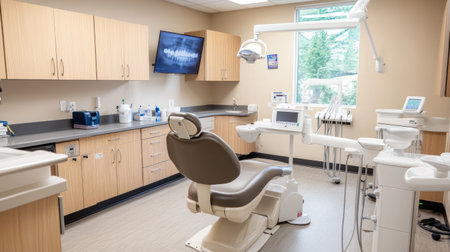 Dentist's office showing equipment, chair, and medical devices in a clean, modern setting, ready for patients