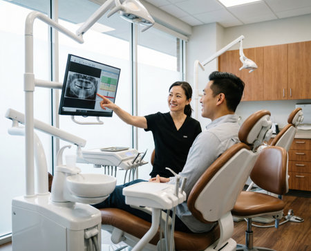 dentist and client are engaged in conversation at a dental clinic. The dentist points to a dental x ray displayed on a screen. The client listens attentively while seated.