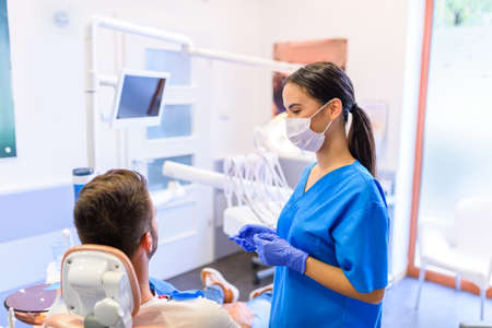 A male dentist with dental tools drills the teeth of a patient with an assistant. The concept of medicine, dentistry and healthcare.