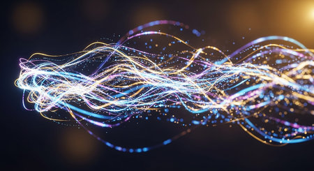Dynamic, swirling trails of electric blue and gold neon light weave and intersect against a deep dark background. The luminous lines create an abstract pattern suggesting energy flow and...