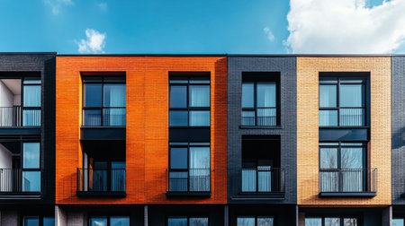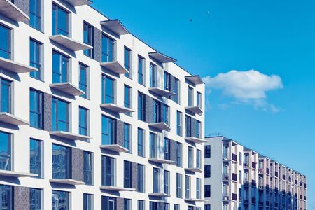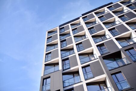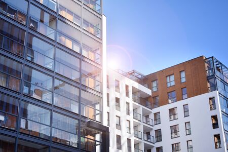 Fragment of modern luxury residential apartment, home house building concept. Modern apartment building on a sunny day with a blue sky.