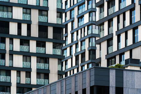 Facade with Windows in Modern residential apartment and flat building exterior. Detail of New luxury house and home complex. Part of City Real estate property and condo architecture. Balconies