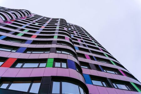 Yekaterinburg, Russia - January 17, 2019: fragment of a multi-colored facade of a modern building on the background of a snowy sky from the bottom up