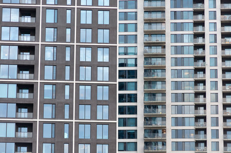 Modern residential apartment buildings showing repetitive geometric facade patterns with windows and balconies. Contemporary urban housing architecture displaying symmetrical grid design elements.