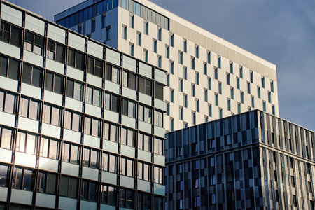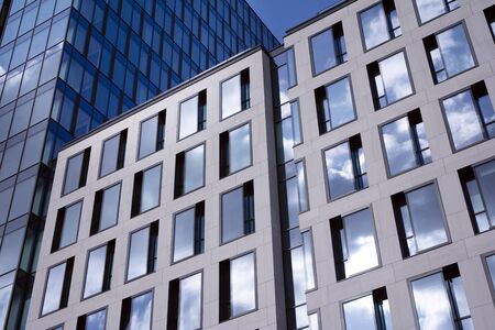 Modern office buildings with glass and concrete facades in city. Corporate offices in contemporary skyscrapers with reflective windows and geometric facades in modern cityscape