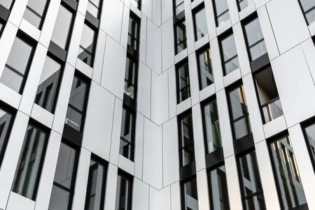 Modern European building. White building with many windows against the blue sky. Abstract architecture, fragment of modern urban geometry.