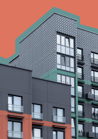 Building corner with green, coral, red, and black facade in geometric pattern. Stylized modern apartment block with trendy design, urban housing, and creative residential concept