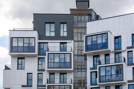 Facade with Windows of Modern residential apartment and flat building exterior. Detail of New luxury house and home complex. Part of City Real estate property and condo architecture. Balconies