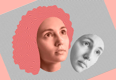 Contemporary art concept collage with fashion girls faces in a zine culture style. Beautiful face young woman.