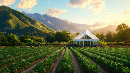 The sun rises behind majestic mountains, illuminating a vineyard filled with lush green plants. A modern greenhouse stands prominently among rows of thriving crops, enhancing the serene rural setting.