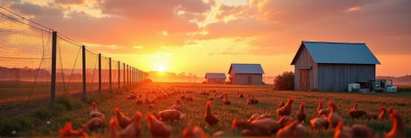 Chickens grazing at sunrise on a peaceful farm landscape. That the image is generated using AI.